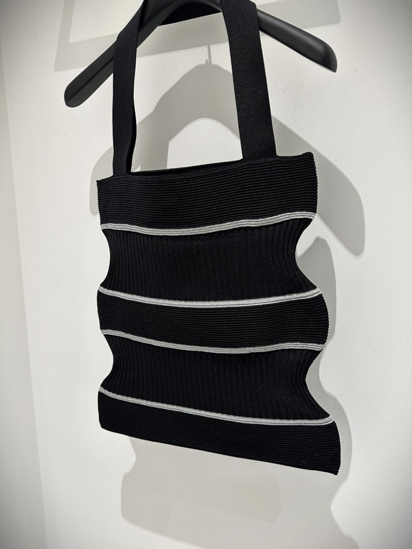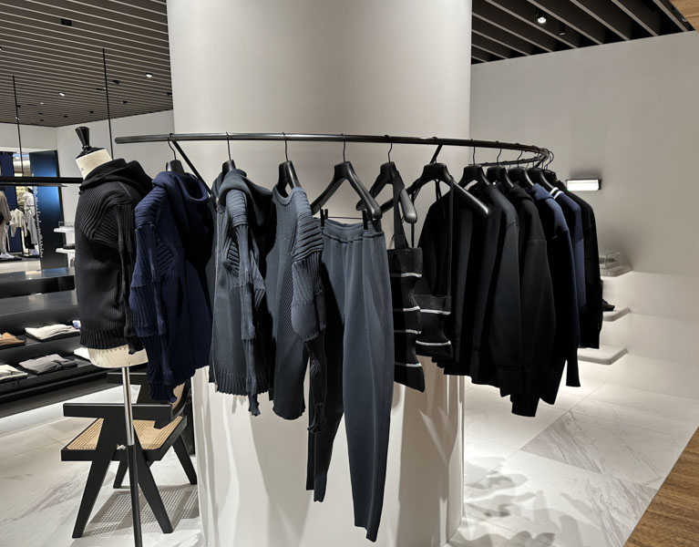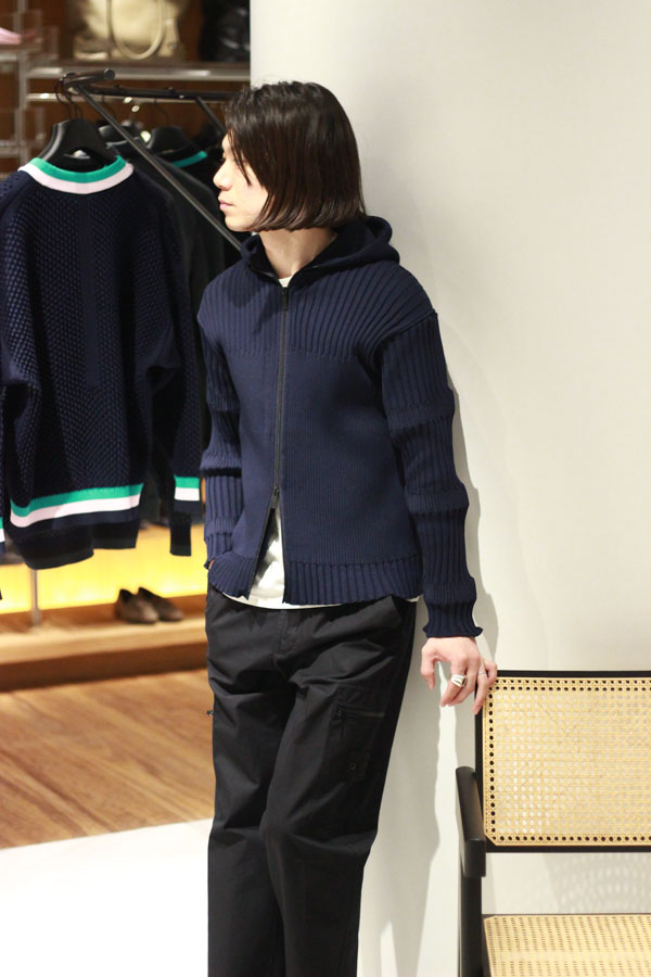 基本的にニットは掛けた状態だと自重で平均5%ほど伸びていくそうですが、CFCLのニットは伸びるのを前提に短い丈で設定するなど工夫もされております。