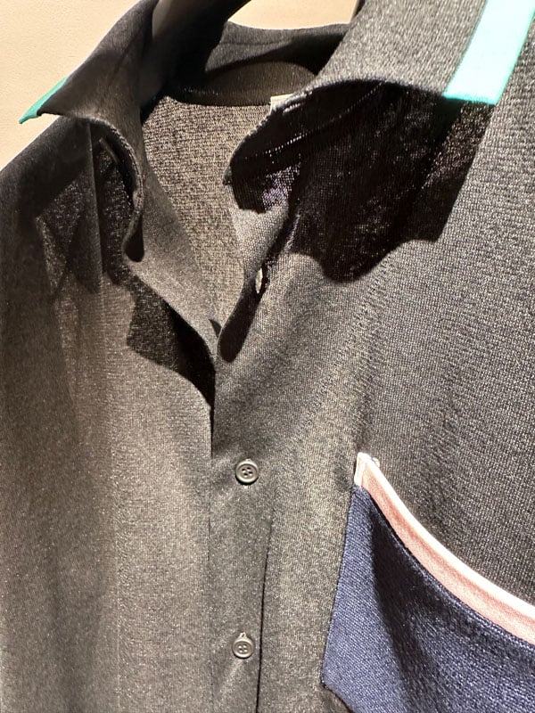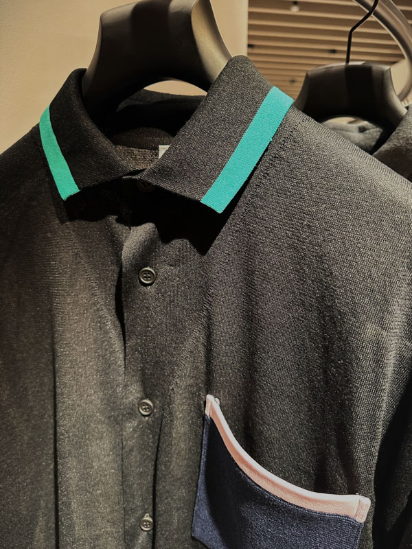 67%オーガニックコットンと33%リサイクルポリエステルを使用したシャツ。襟の部分は別シリーズと合わせた今シーズンのカラーチョイスです。