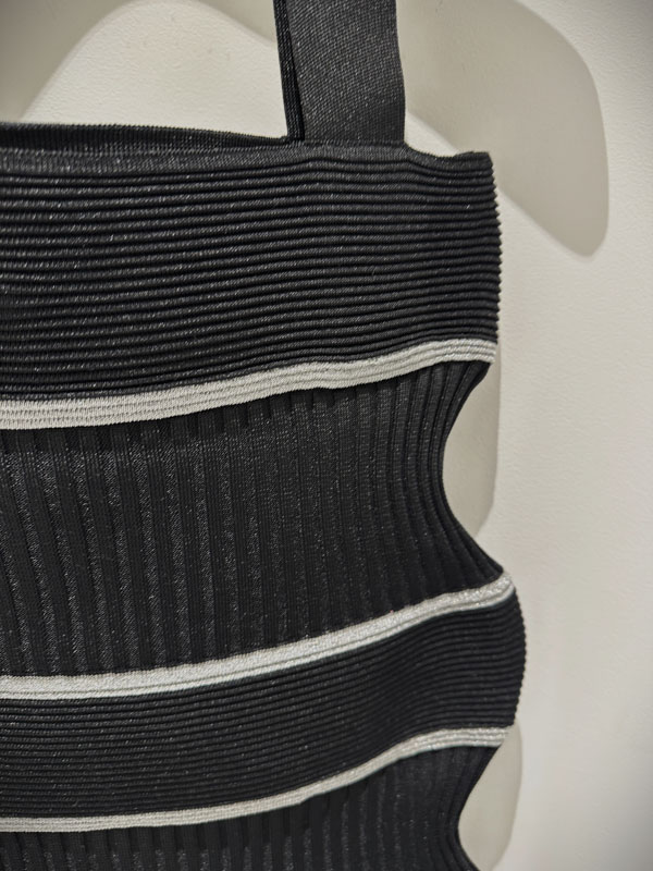 ストラータとは地層の意味で、タック編みと針抜きリブの組織違いで交互にできる段差が地層のようであることから名付けられています。