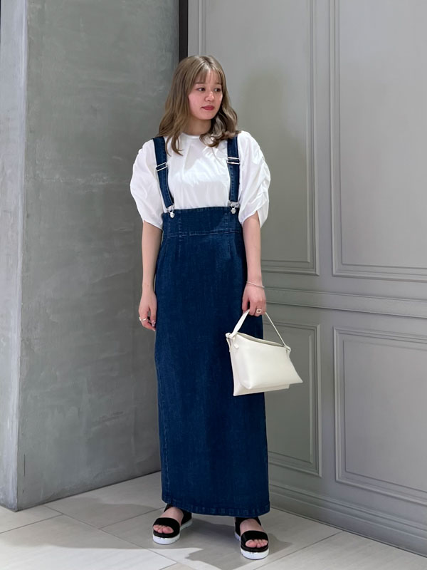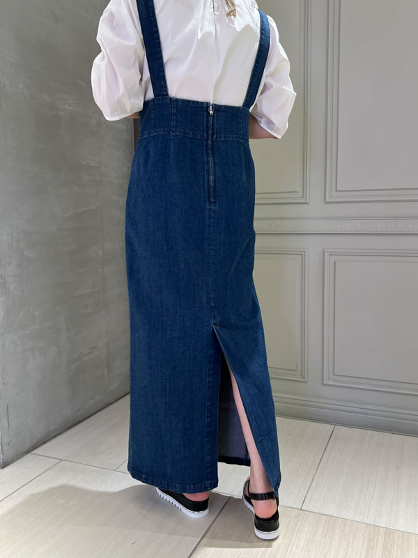 ロング丈でストンとしたシルエットのジャンパースカートはブルーとダークインディゴの2色展開。