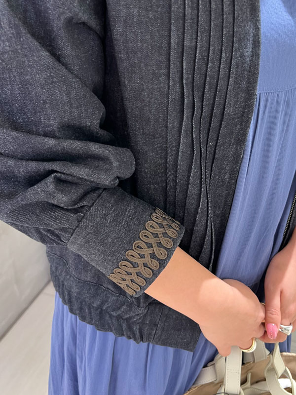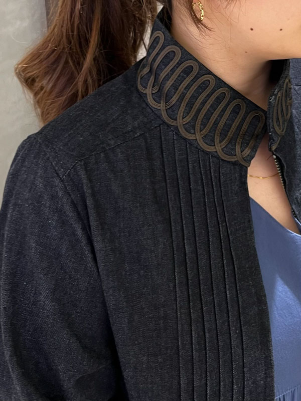 襟元は高く、カフスは長めにし、大胆にあしらったコード刺繍はモードな印象を与え、コーディネートの主役になってくれる一枚です!