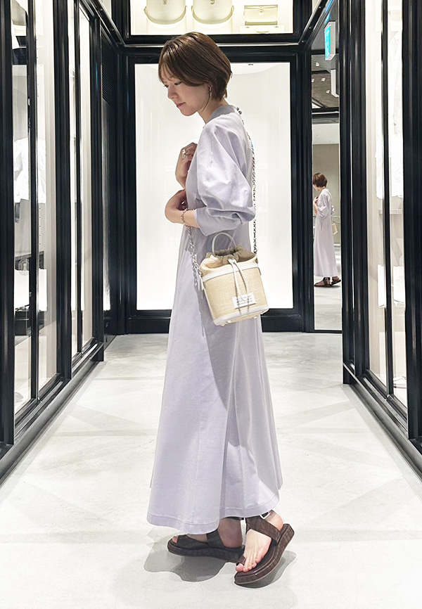 沢山歩くので小物は歩きやすいフラットなサンダルをチョイス。ナチュラルなカゴバッグを合わせて爽やかな印象に。小物は少しモードにふってマメのデザイン性を活かしたスタイリングにしました。淡い柔らかな色味を引き立てるため、黒を使わないことが自分なりのポイントです。