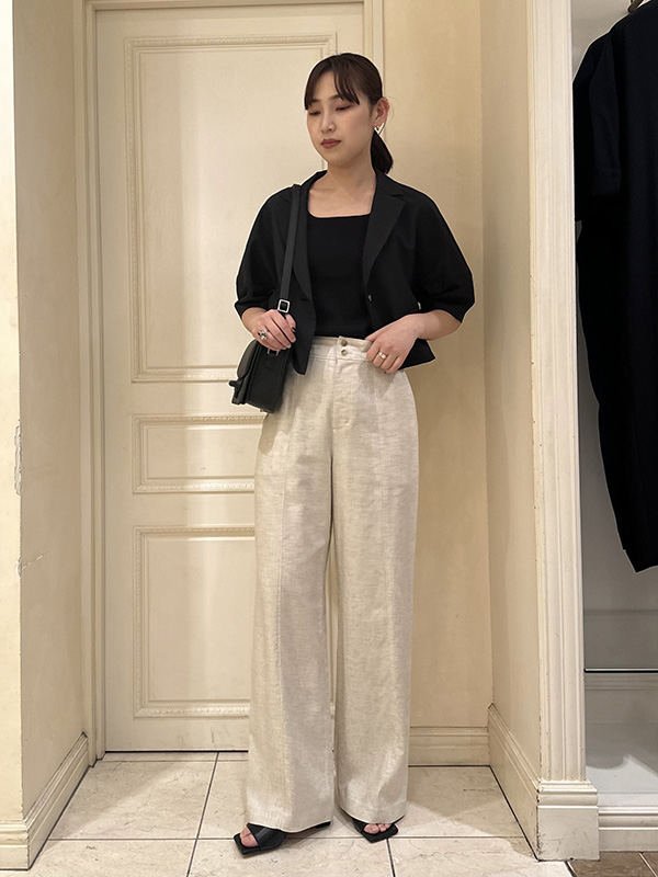ハイウエストなのでトップスに短い丈のものを合わせるとさらにスタイルアップも叶います!