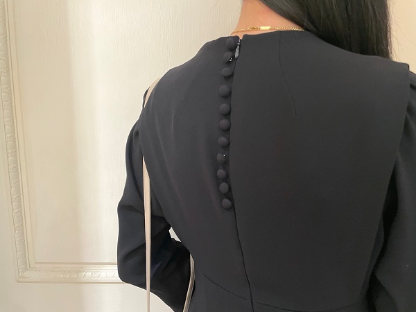 かっちりとした見た目ですが、着心地が楽なのでいつも通りの自分でいられます。技巧を凝らしたドレスは着る人だけでなく、その場にいる人の気持ちも晴れやかにしてくれると思います。