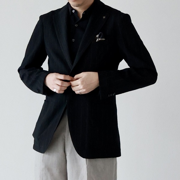 幅が広いほど男性らしく力強く見えます。モードブランドのテーラードジャケットは比較的細いものが多いので、ジャケットを選ぶ際の一つの参考にすると良いかもしれません!