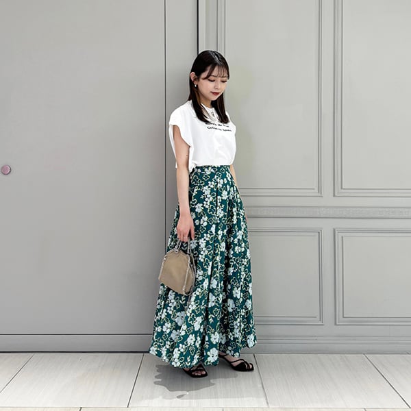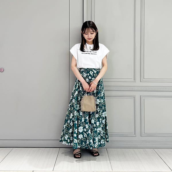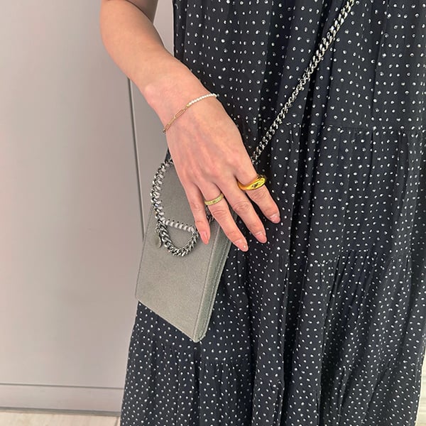 カットソー×スカートのスタイリングの際には、手元にシルバーアクセサリーを多めに着用し女性らしさをプラスすることがオススメです。