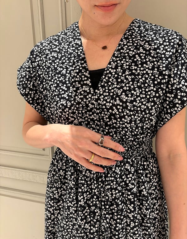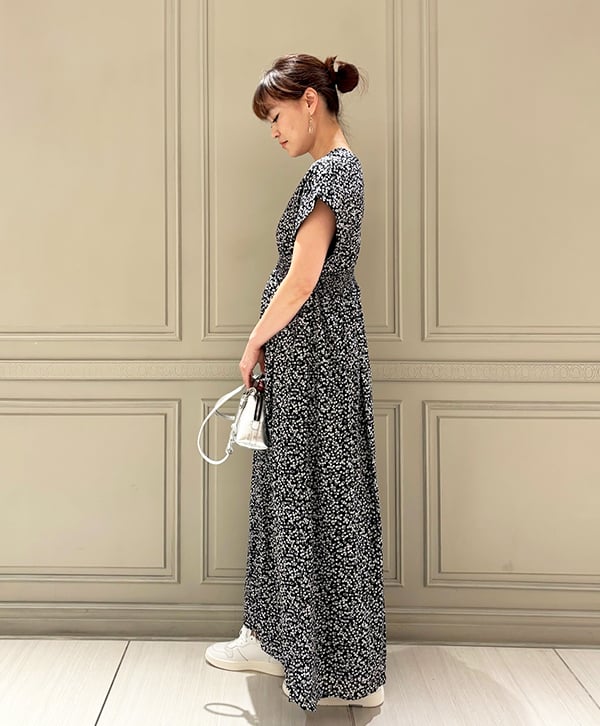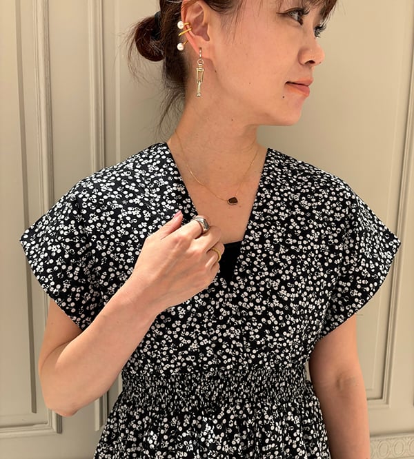 シックな小花柄を合わせた特別な一着。夏の光のドレスはカフタン風のデザインに、からだが細くすっきりと見えるように計算されたシルエットが魅力。