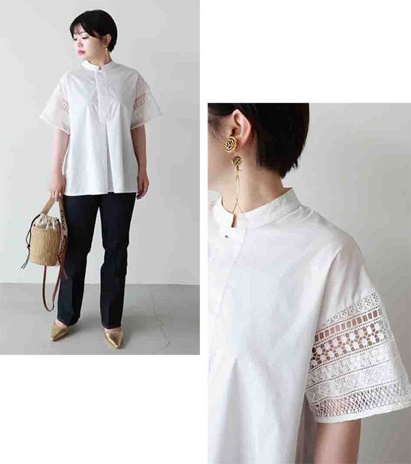 体形カバーもできる袖レースブラウスは、上品な透け感でオフィスにも。