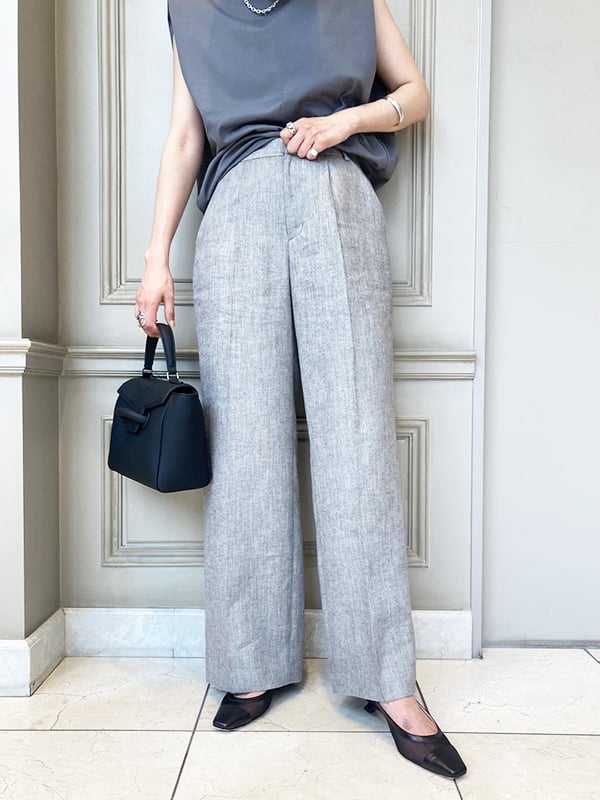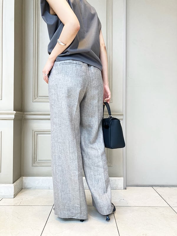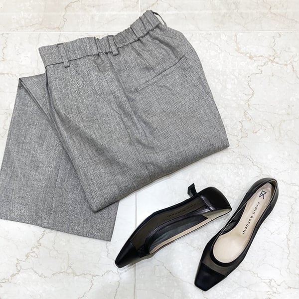 バッグやシューズのシルバー小物はオシャレだけどチャレンジするにはハードルが高いという方は、ラメ糸が入った美しい素材のセミワイドパンツでキラメキをプラスして。履くだけで上品な印象を与えてくれるので、お仕事需要にもオススメです!!