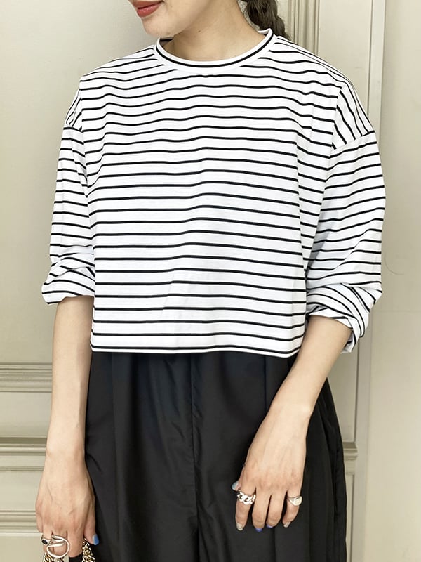 ショート丈でトレンドライクに仕上げた長袖のボーダーカットソーは、ドロップショルダーでリラクシーな着心地が魅力です!