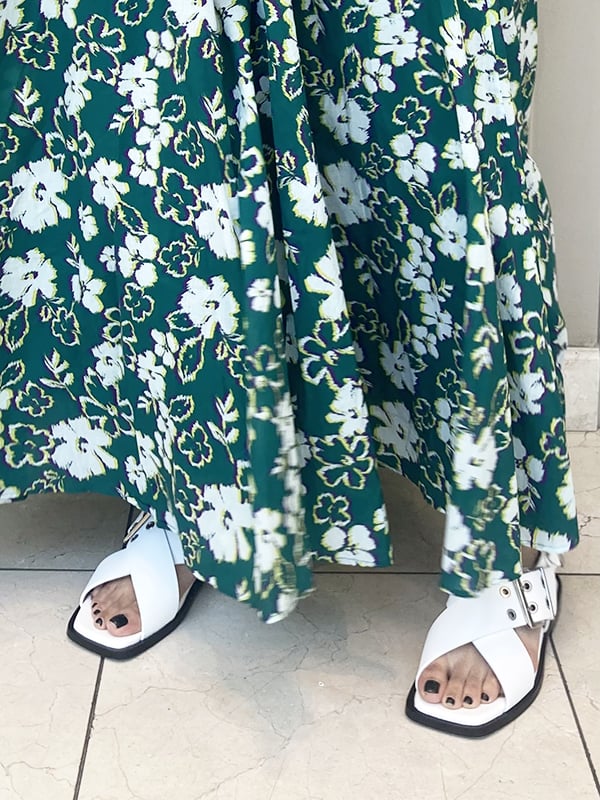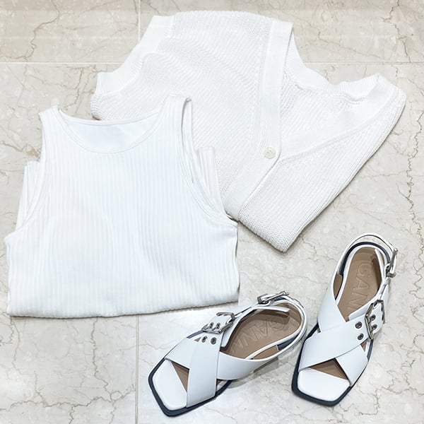 最後にアメリカンスリーブキャミソール×2wayニットカーディガン×クロスストラップサンダルの爽やか、涼やか、軽やかの三拍子そろったホワイトアイテムのスタイリングを締めくくり!!