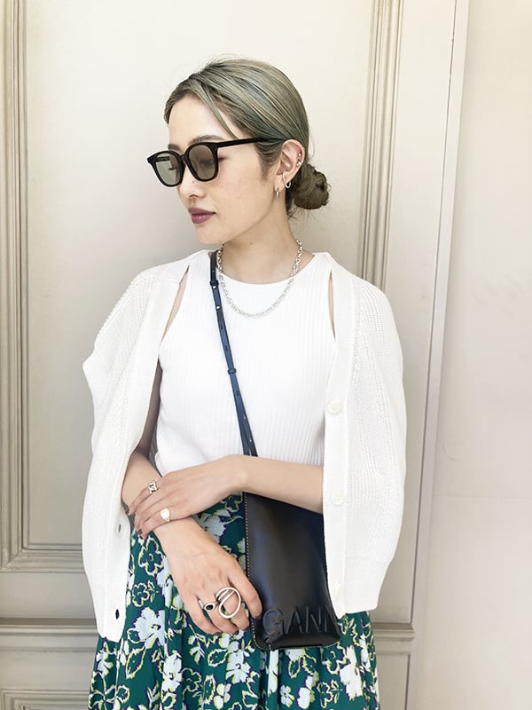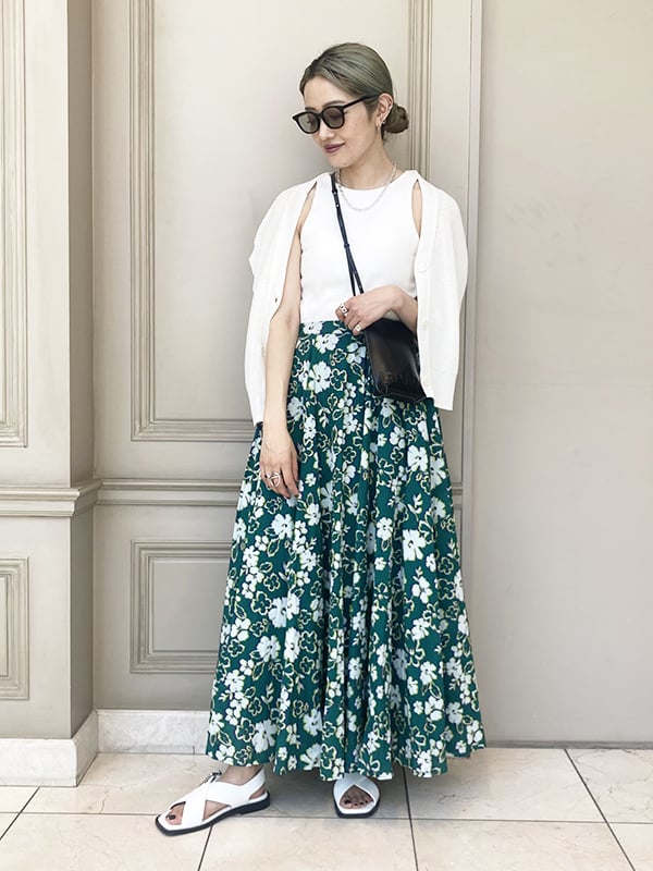 ホワイトアイテムの中に柄ボトムを投入し、アメスリのタンクトップでフレッシュに!