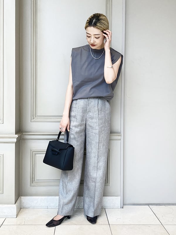カットソー合わせでも、大人のきれいめスタイルを叶えてくれるパンツです。バッグとシューズは、綺麗めなものを選んでバランスをとりたい。