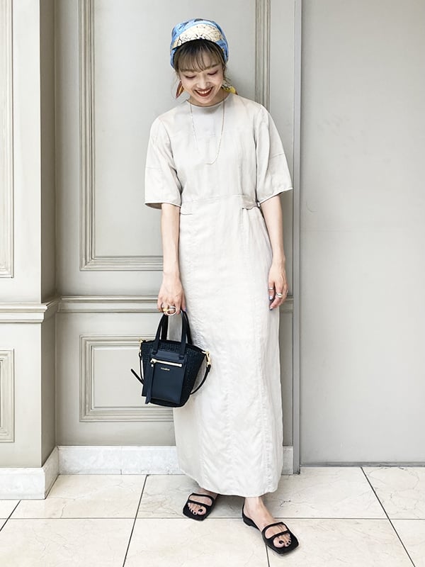 程良くふんわりとした立体的なボリュームスリーブが女性らしさを演出してくれます。スリット入りで足捌きの良さも◎小物はブラックで落ち着きのある大人感を演出したい。ラフなカゴバッグに線の細い抜きのあるサンダルと、ベージュのワンピースの柔らかな雰囲気を損なわないアイテムをチョイスして。
