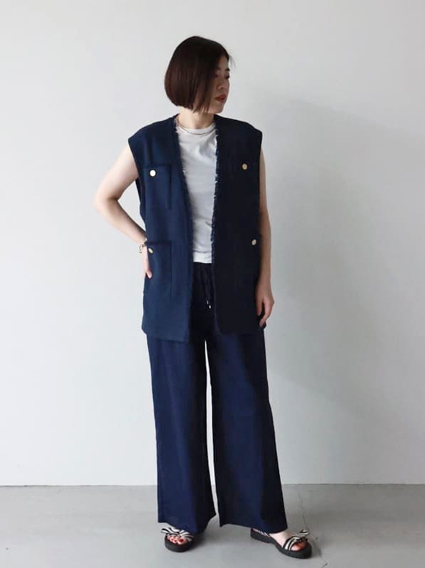 Tシャツとパンツ、スカートとのシンプルコーデはもちろん、そのまま着るとなんとなく心もとない日は、ジレやベストを重ねるとたちまちおしゃれ見え!