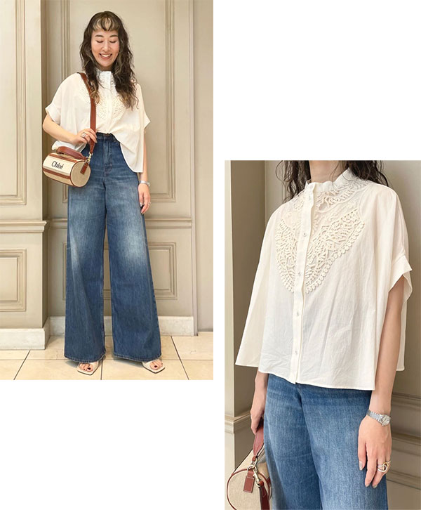 デニムコーデがキレイ見えする大人にぴったりな透けトップスです。
