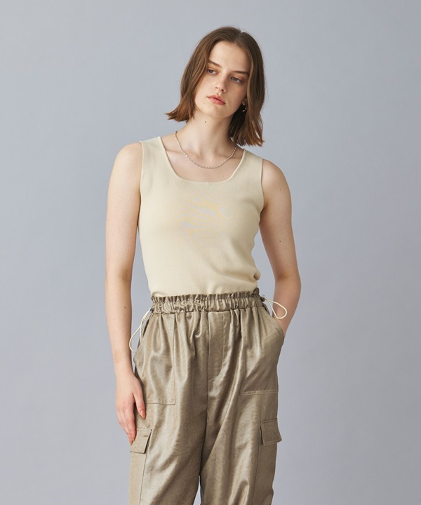 柔らかいニット素材で、包まれているような心地よさ。鎖骨が際立つスクエアカットと安定感のある太いストラップで、トレンドのアメスリタンクと比べても二の腕が目立ちにくい。タンク初心者または苦手なママにもおすすめ!