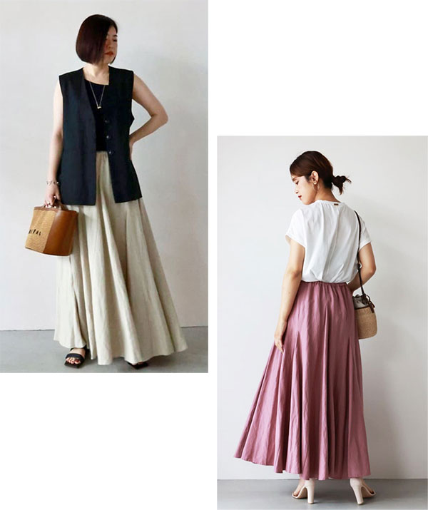程よいボリューム感のスカートは、素材違いのトップスや小物でメリハリをつけてみて!
