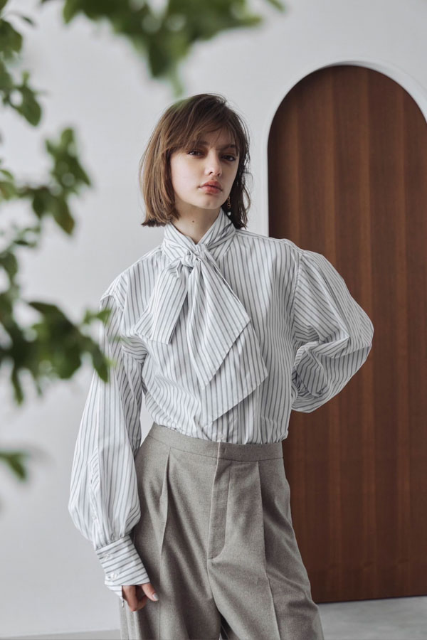 コンパクトな身頃のデザインとボリューム袖のコントラストが印象的なボウタイブラウス。