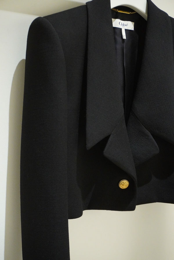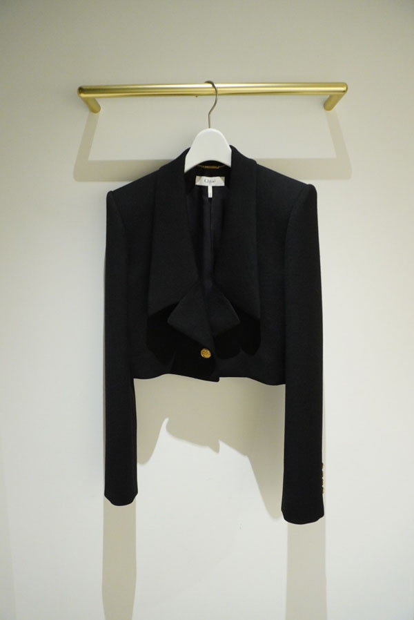 ヘリテージラペルとクロップド丈が特徴的なジャケット。身頃と袖口にあしらわれたゴールドトーンのミリタリーボタンがポイントになっています。