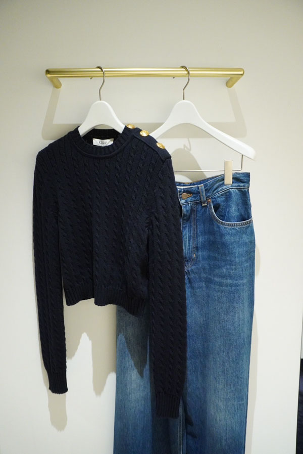 長めに設定されたロングスリーブとクロップドの着丈が特徴のニット。肩に施されたゴールドトーンのミリタリーボタンがアクセントになっています。