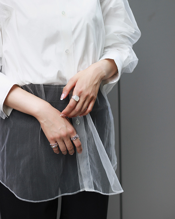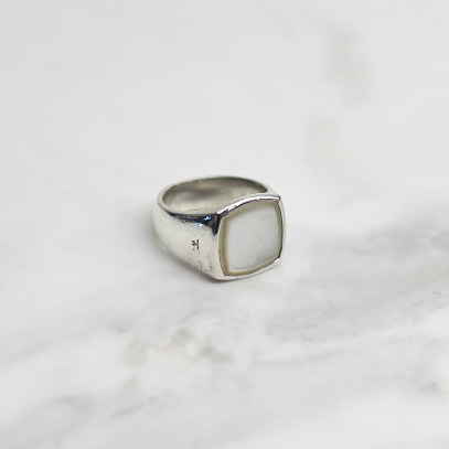 ‐ Cushion White Mother of Pealは2年半近く毎日欠かさず付けている私のスタメンリングです。仕事の日もプライベートの日もほぼ毎日欠かさずに付けているので、メッキではないシルバーならではの味が出てきています。使用を重ねるにつれできた小さな傷やくすみが、自分だけのものになっていく感じがあり、より愛着が湧いています。