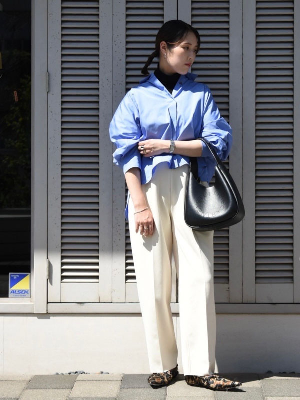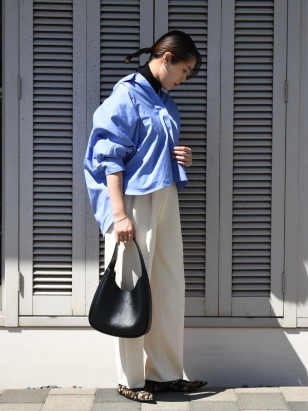 ボトムスは白パンツで鮮やかなブルーを際立たせ、小物はダークトーンで秋らしさを加えて完成です❤
