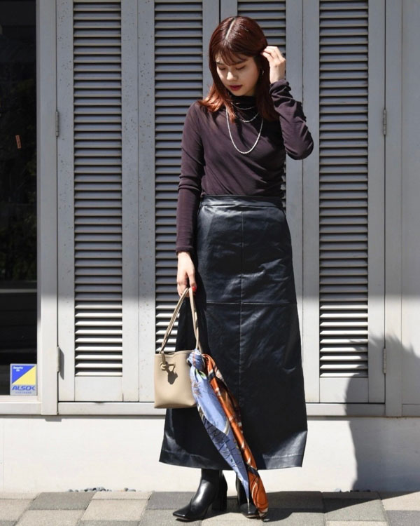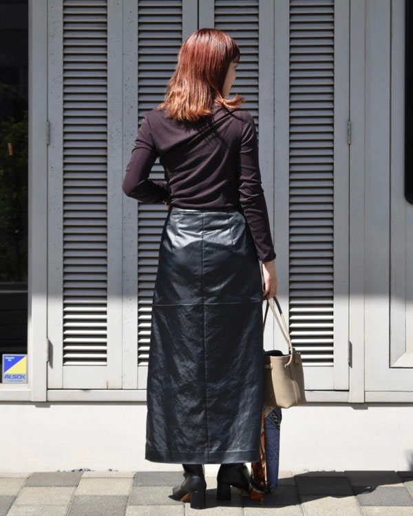 ボトムスはレザースカート、バッグはベージュで柔らかくして甘さのある辛口コーデの完成です❤