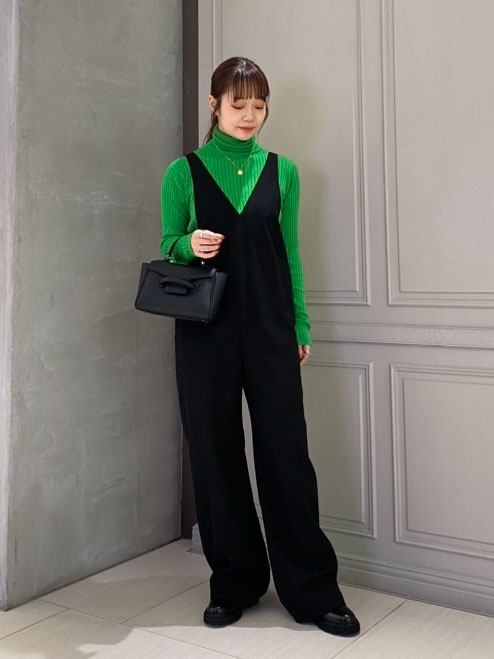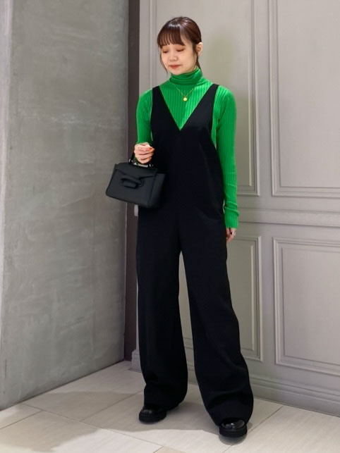 鮮やかなグリーンがポイントのサロペットコーディネート。