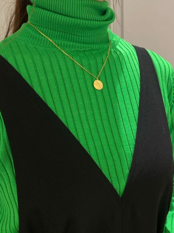 インナーのリブタートルニットはベーシックながら、天然シルク100%で肌触りがとても良く、上品な光沢感もあり、薄手でも保湿性が高くワードローブに欲しいアイテムです。
