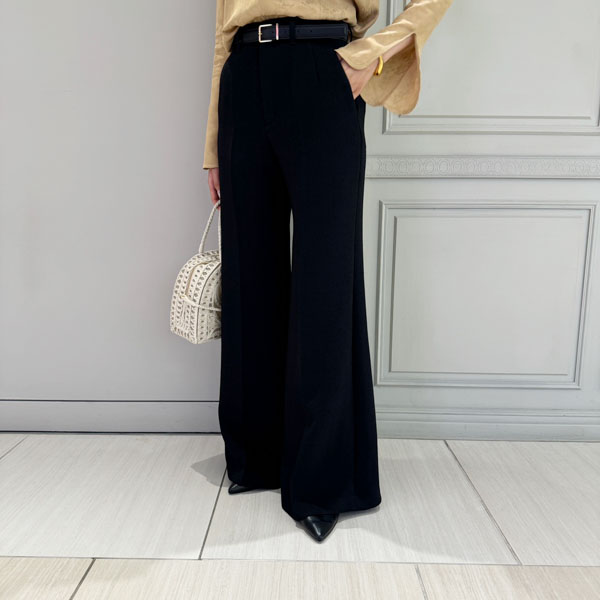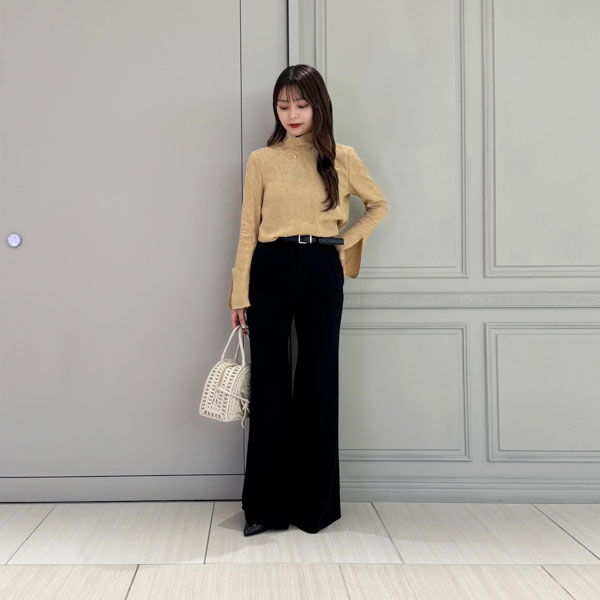 ヒップも覆う長めの着丈で、腰回りはスッキリとしながらも裾にかけてフレアのシルエットが美しいパンツとの相性もぴったりです。