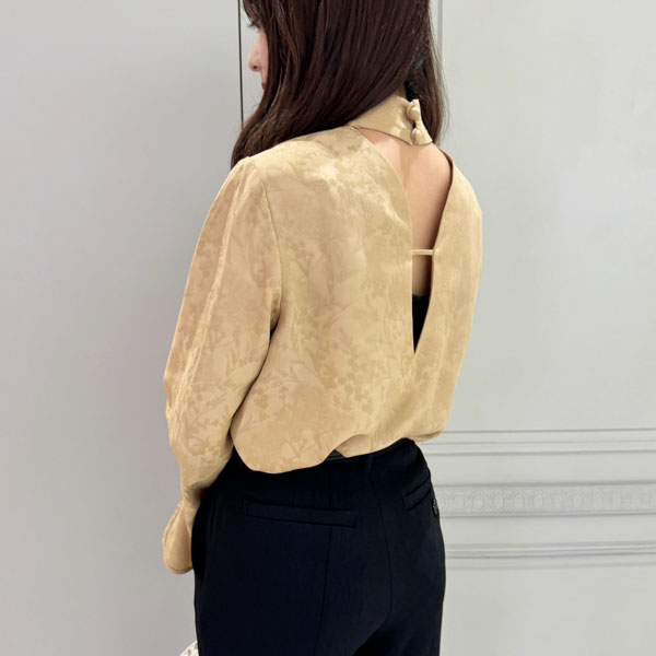 ブラウスはバックスタイルの深めの開きとお袖のスリットが女性らしさを出してくれます。