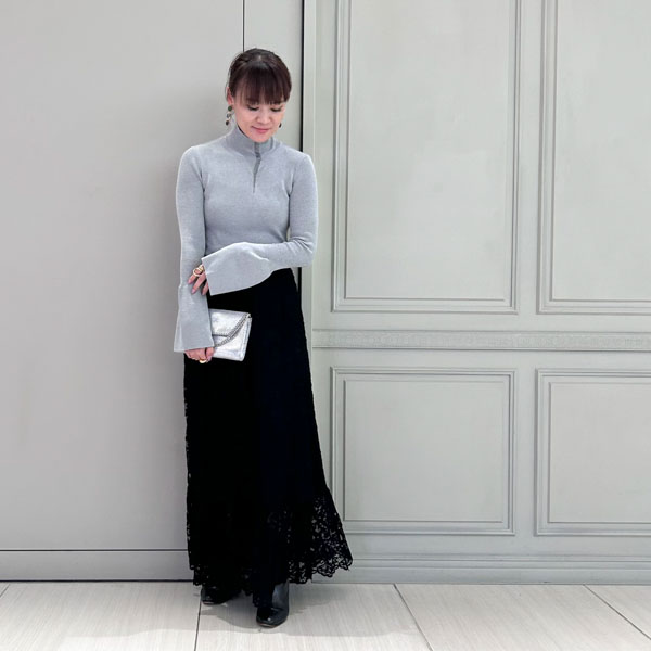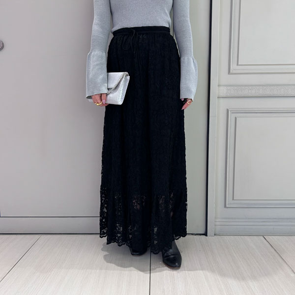 レーススカートは同色で合わせるとやや重たい印象にもなりがちなので、トップスにやや明るいカラーを持っていくことでより着やすさもアップします!!