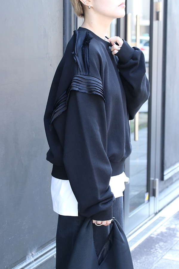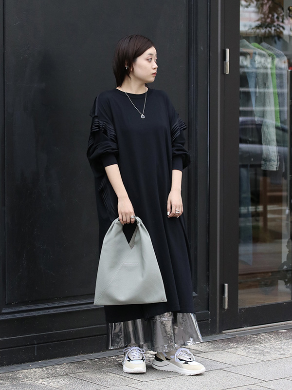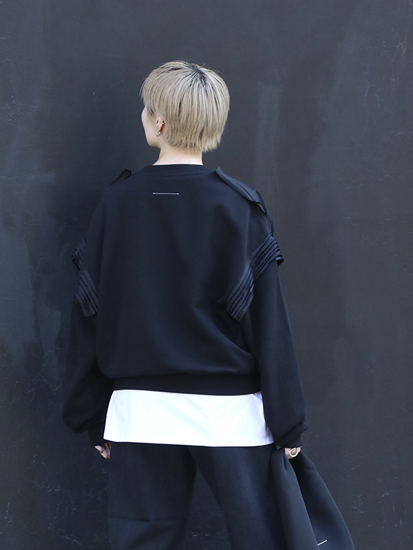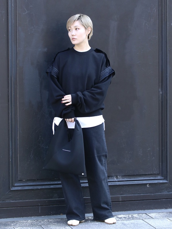 シンプルなスウェットなのですが、ワンピースと同様にMM6のロゴ入りビスコースリボンが肩周りにあしらわれています。普段のスウェットコーデに一癖加えたい方へ、ヘビロテ間違いなしの1着です◎