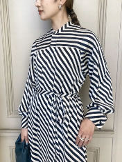 コレクションでも目をひいた、バイヤスにプリントされたストライプも印象的な雰囲気。