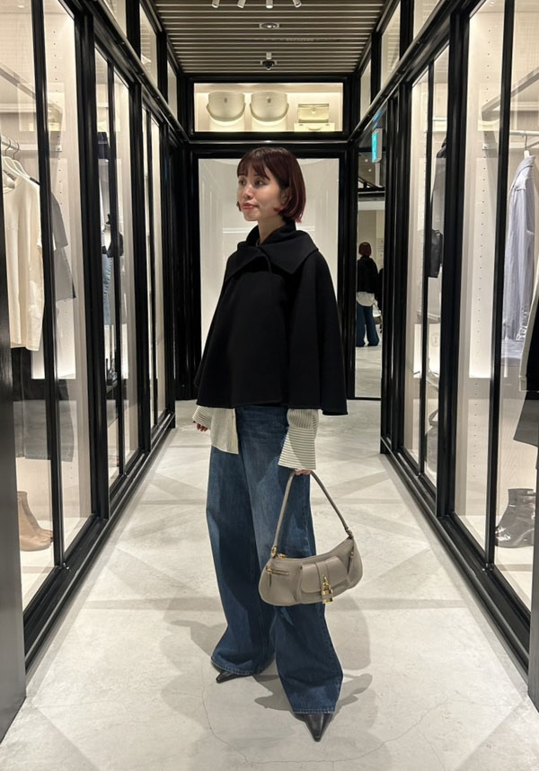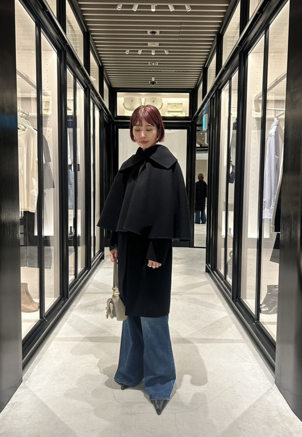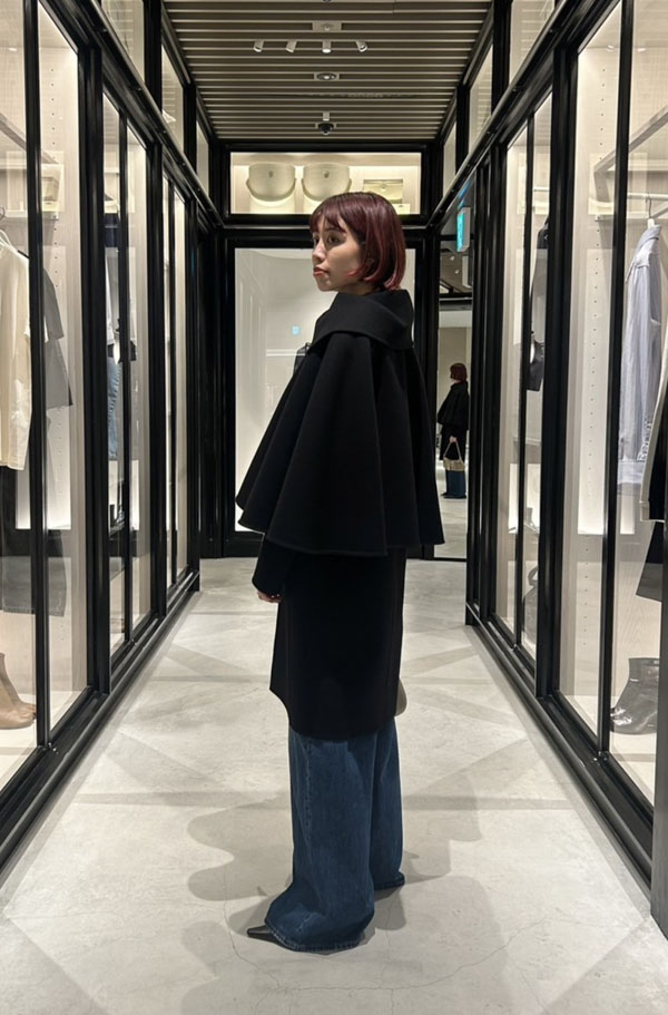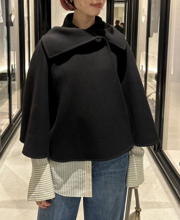 なんといっても、ウールカシミヤのしなやかな素材が上品で、ケープにした時のドレープ感が美しい逸品です。デザインも、ベーシックながらも目を惹くアウターです。