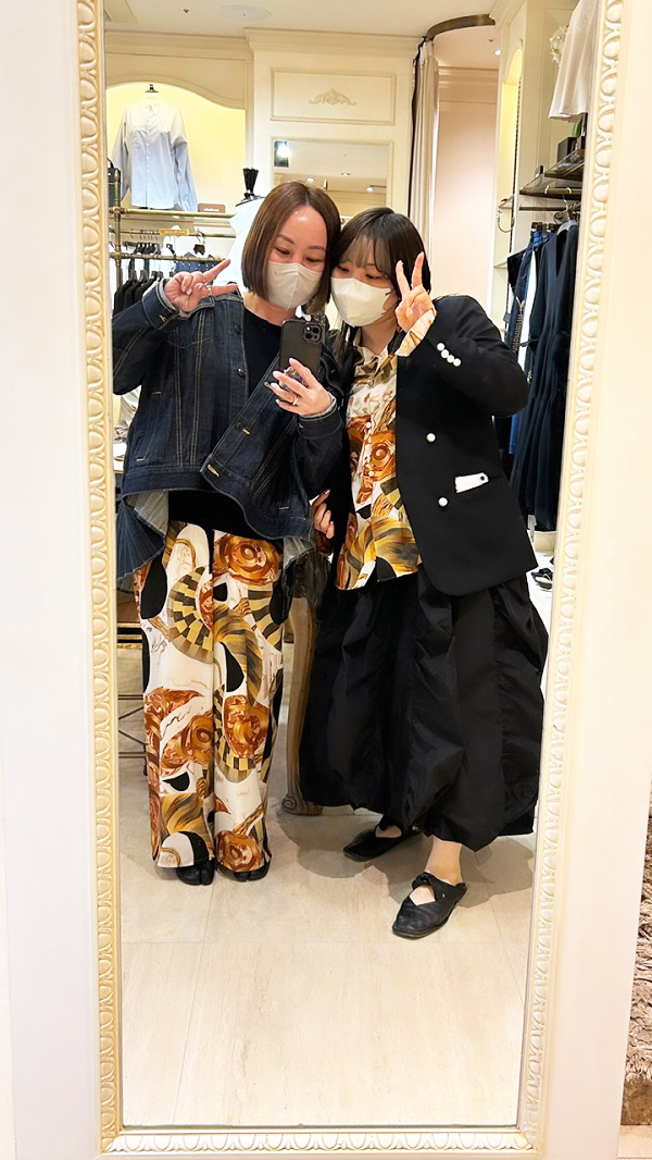 2023年AWの竹籠シリーズのプリント柄はとても華やかで気持ちも明るくなります。ふるみつはシャツ、私はワイドパンツを愛用♪