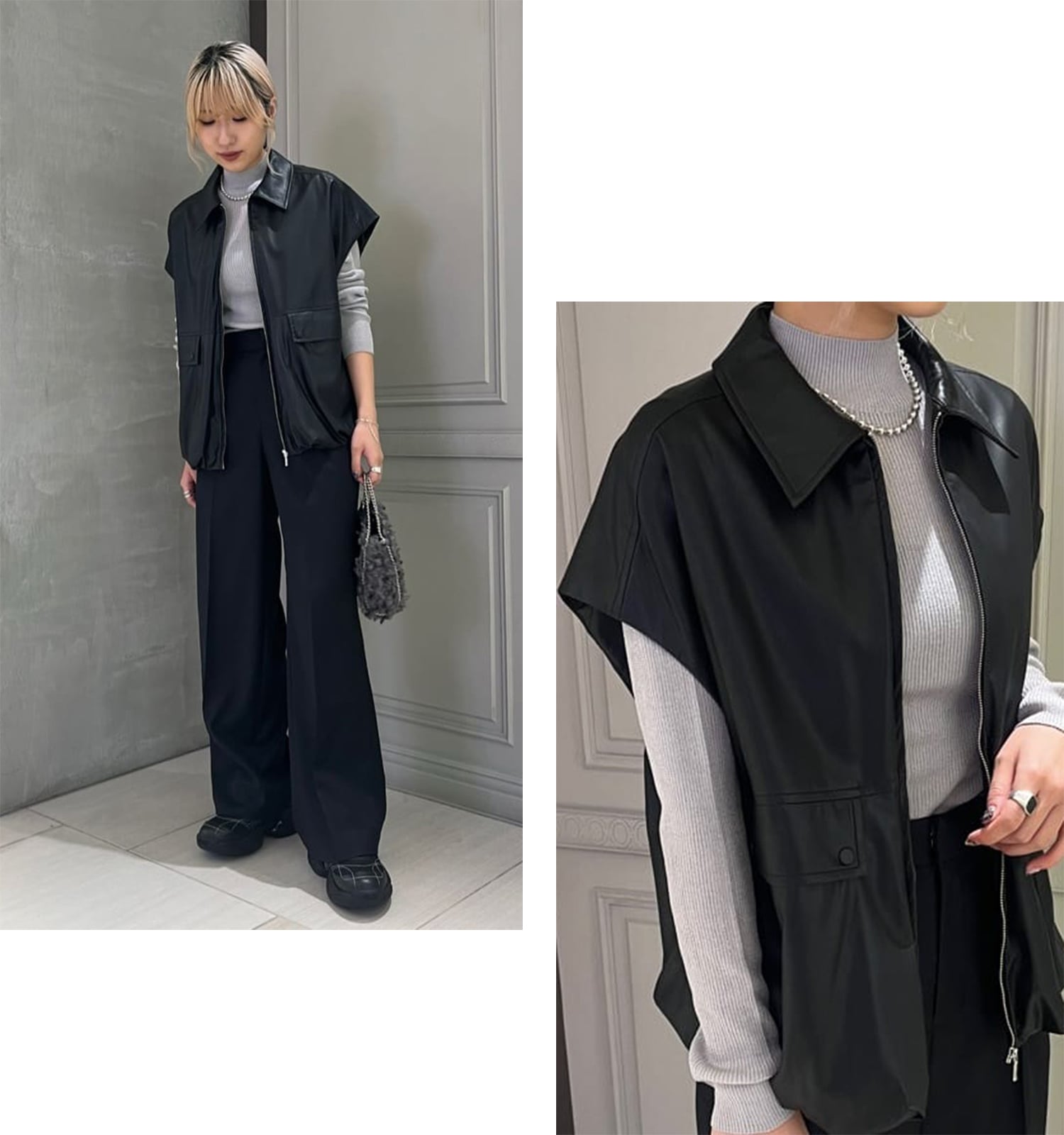 エコレザーのベストはこの秋冬のコーデにモードな気分をプラスしたい時にぴったりです^^!