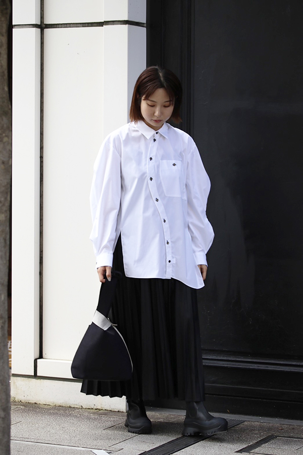 今回はモードカジュアルなコーディネートに合わせてみました。シルバーのスタッズがいいアクセントになり、全体をまとめくれます。