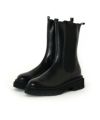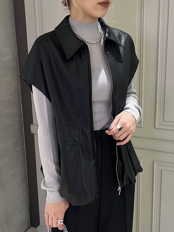 シルクラメリブニットに、ブラックのパンツとレザーベストを合わせたモードスタイル。