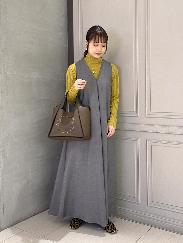 毎年大好評のシルクカシミヤハイネックに、上質なウールのワンピースを重ねた楽ちんお出掛けコーデ。