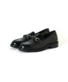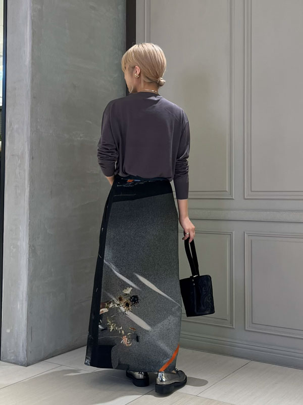 トップスをチャコールにすることで、ダークトーンの柄スカートを合わせても強い印象になり過ぎず、抜け感のあるコーデに!
