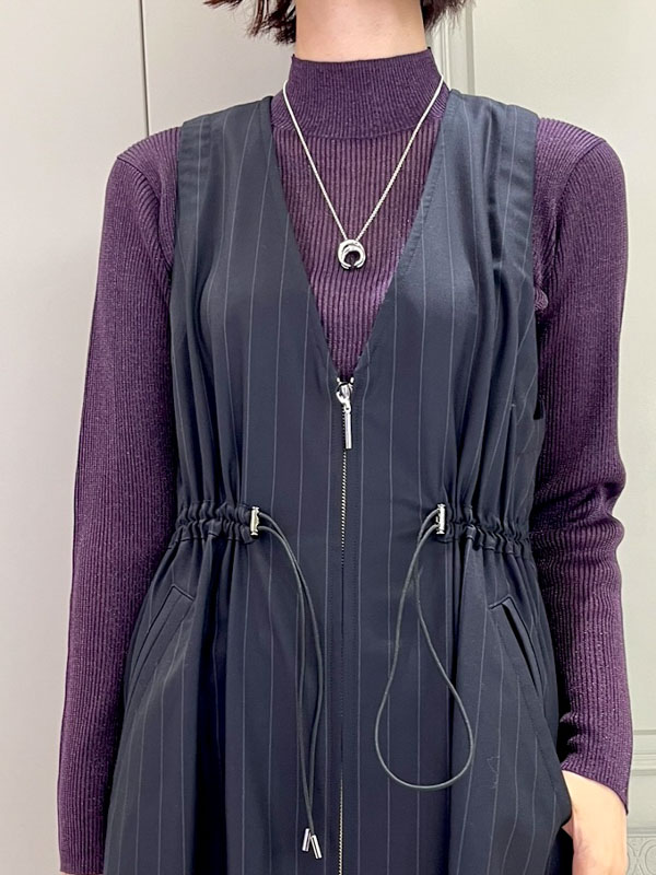 ワンピースは紺ストライプがマニッシュな印象ですが、細リブのラメトップスによって程よくフェミニンさが足され、女性らしさを残した大人コーデに✨