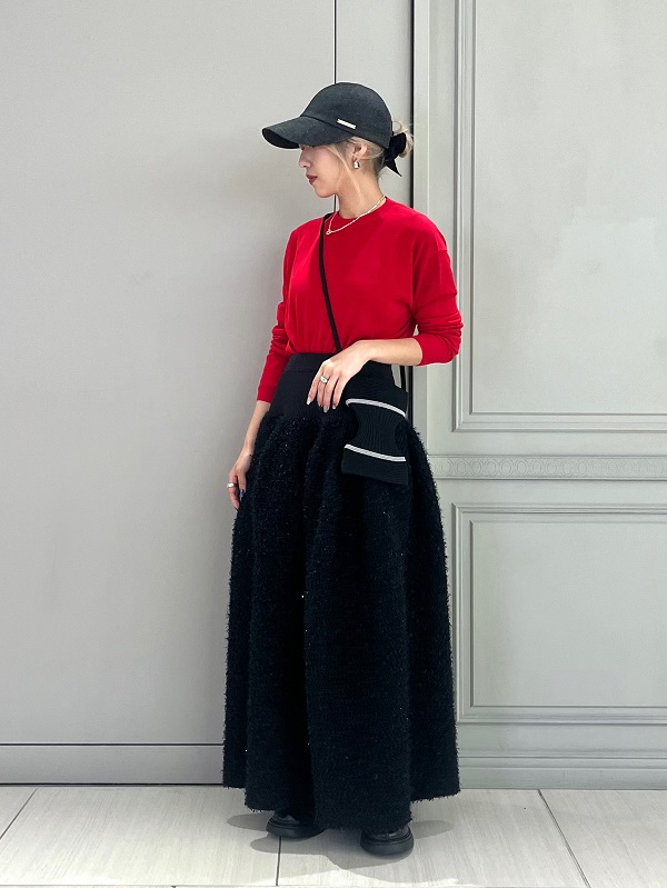 同じニット×スカートの組み合わせでも、赤×黒のパキッと配色で一気に華やかな印象に。
