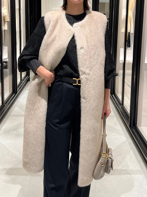 スタッフhina.の着こなしポイントはトレンドのファーベストと合わせてよりエレガントさを演出しています。