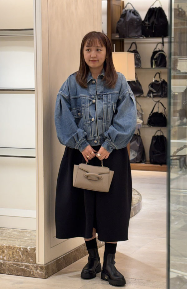 ボリューム感のあるジャケットなのでIラインシルエットで緩急をつけたコーディネートです。デニムなのでカジュアルスタイルがマッチしやすいのですがメリハリのあるコーディネートは大人らしさが演出できます。