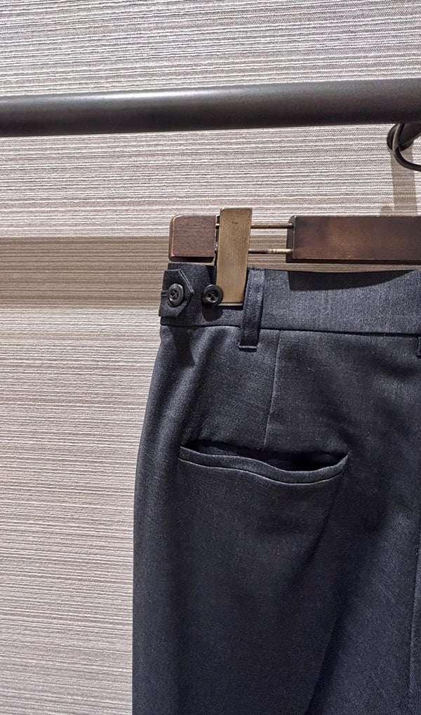 ウエストはサイドのアジャスターボタンで腰周りの浮きも抑えてくれ、オンオフ様々なシーンで活躍する汎用性の高いパンツなのでウエストインのスタイリングも様になります。