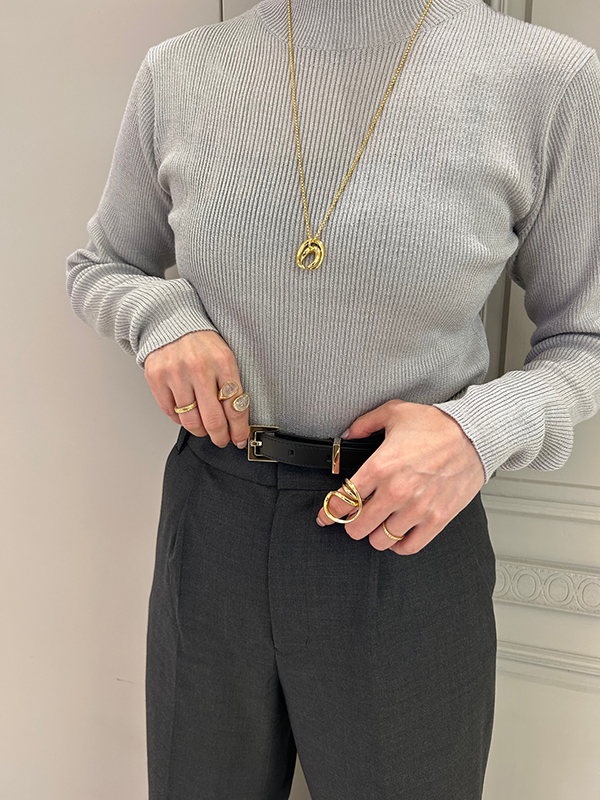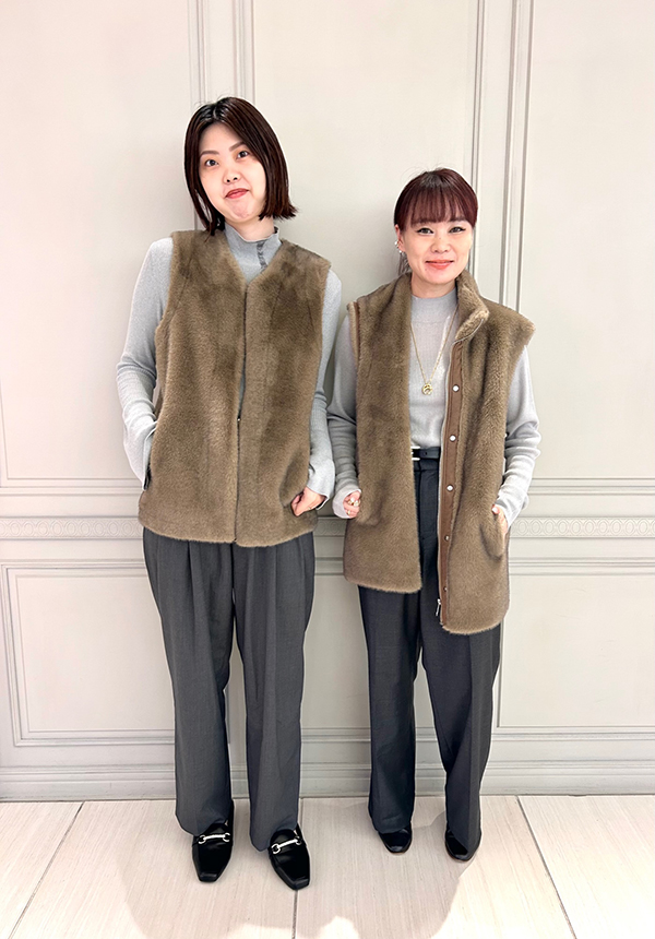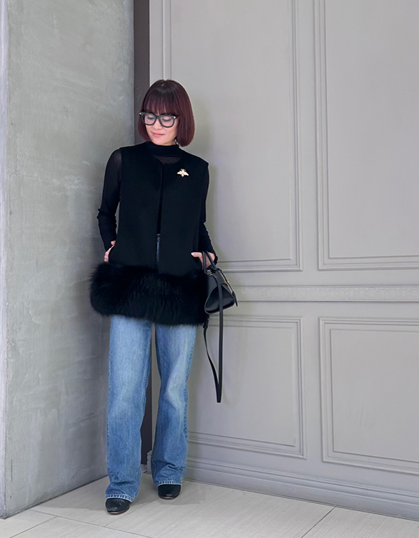 このパンツに合わせてよく着用しているのが、昨年購入したルーアンドレアのファーベストです。どちらのアイテムも身に付けた時の高揚感があり、使い続ける中での「愛おしさが続くアイテム」として愛でていきたいアイテムです。