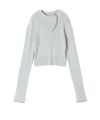 ラインが特徴のクルーネックニットは、欠けた器を漆で継ぎ金などで装飾する「金継ぎ」を忠実に再現したデザインです。