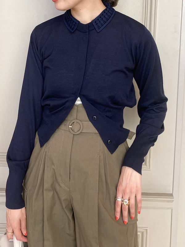 マメのアイコニックな刺繍が着こなしのアクセントになるニットカーディガン。